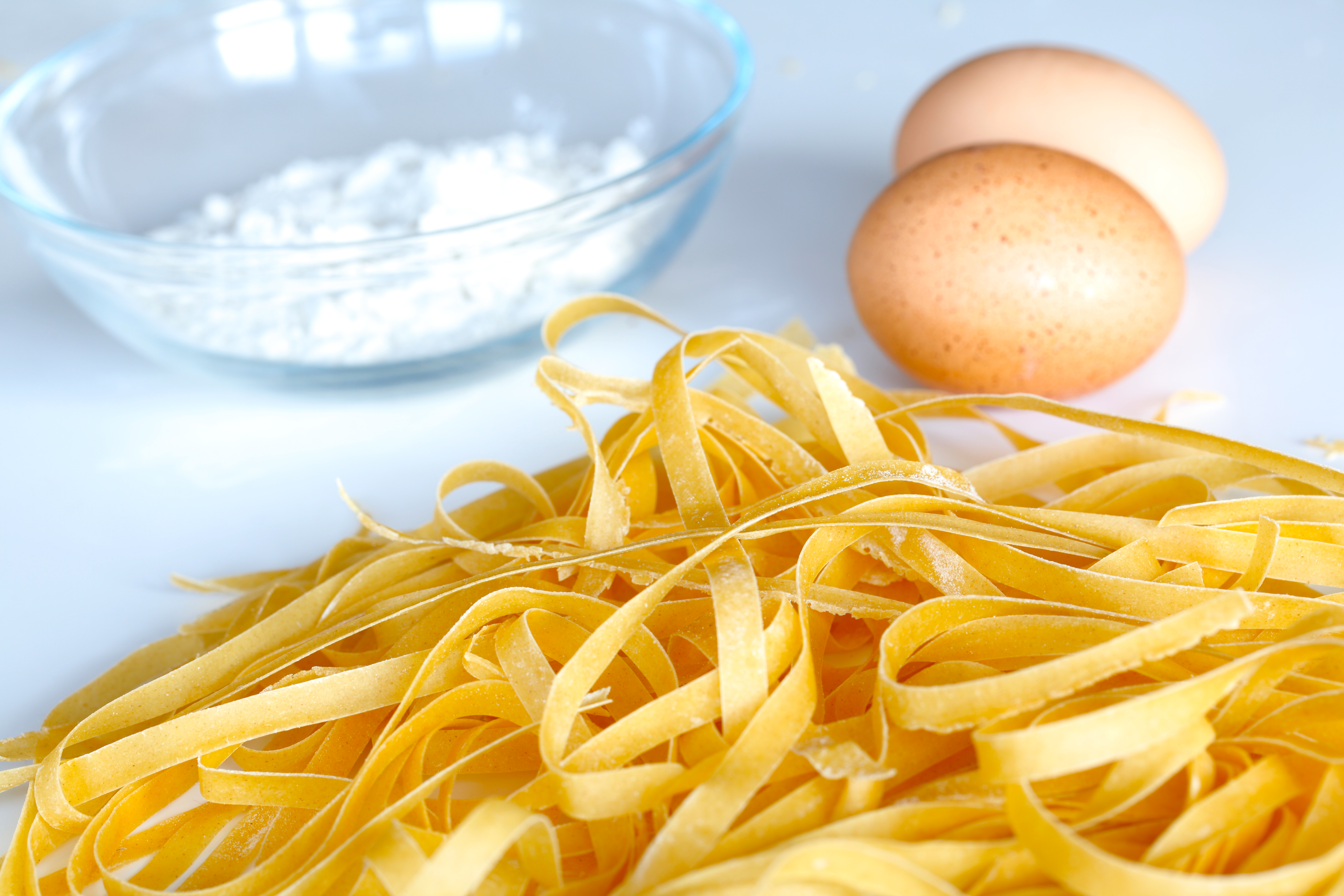 Eno tako pravilo oziroma recept “na oko” narekuje da na vsakih 100 g moke damo eno jajce. In to je to kar rabiš. No, obstajajo tudi recepti, ki nimajo sploh jajc pa nekateri, ki se hvalijo da imajo po 10 rumenjakov na 100 g moke… Potem mešaš in valjaš in režeš in vržeš v vodo za par minut in voila… ni ga čez sveže testenine.