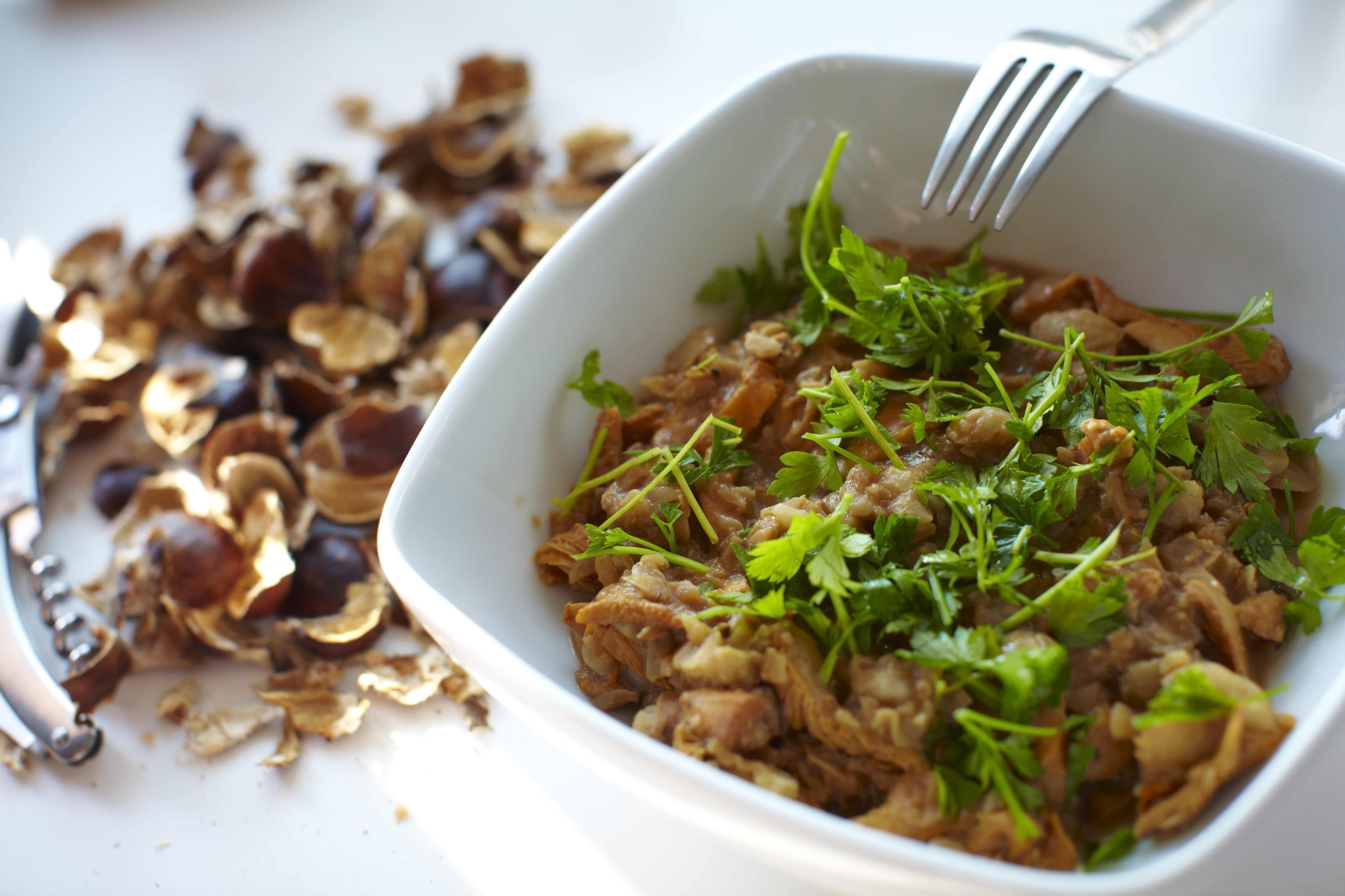 450 g kostanja olupiš – s tisto tanko ovojnico vred, saj je zelo grenka. V ponvi nato segreješ 25 g masla in dušiš 1 sesekljano čebulo približno 45 minut. Potem dodaš 2 strta česna in nekaj vejic sesekljanega svežega timijana. V ponev nato streseš olupljen kostanj, 300 ml zelenjavne osnove in 150 ml temnega piva in kuhaš toliko časa, da je kostanj primerno mehak. V drugi ponvi segreješ 25g masla in na hitro pražiš narezane gobe potem pa jih dodaš h kostanju. Kuhaš še 5 minut. Potem kostanj in gobe vzameš iz posode preostalo tekočino pa malce prevreš, da se dovolj zgosti. Kostanj in gobe razporediš na krožnike, soliš in popraš nato pa čez preliješ omako, potreseš s svežimi dišavnicami. Zraven se kot priloga zelo dobro poda pire iz kolerabe in krompirja.