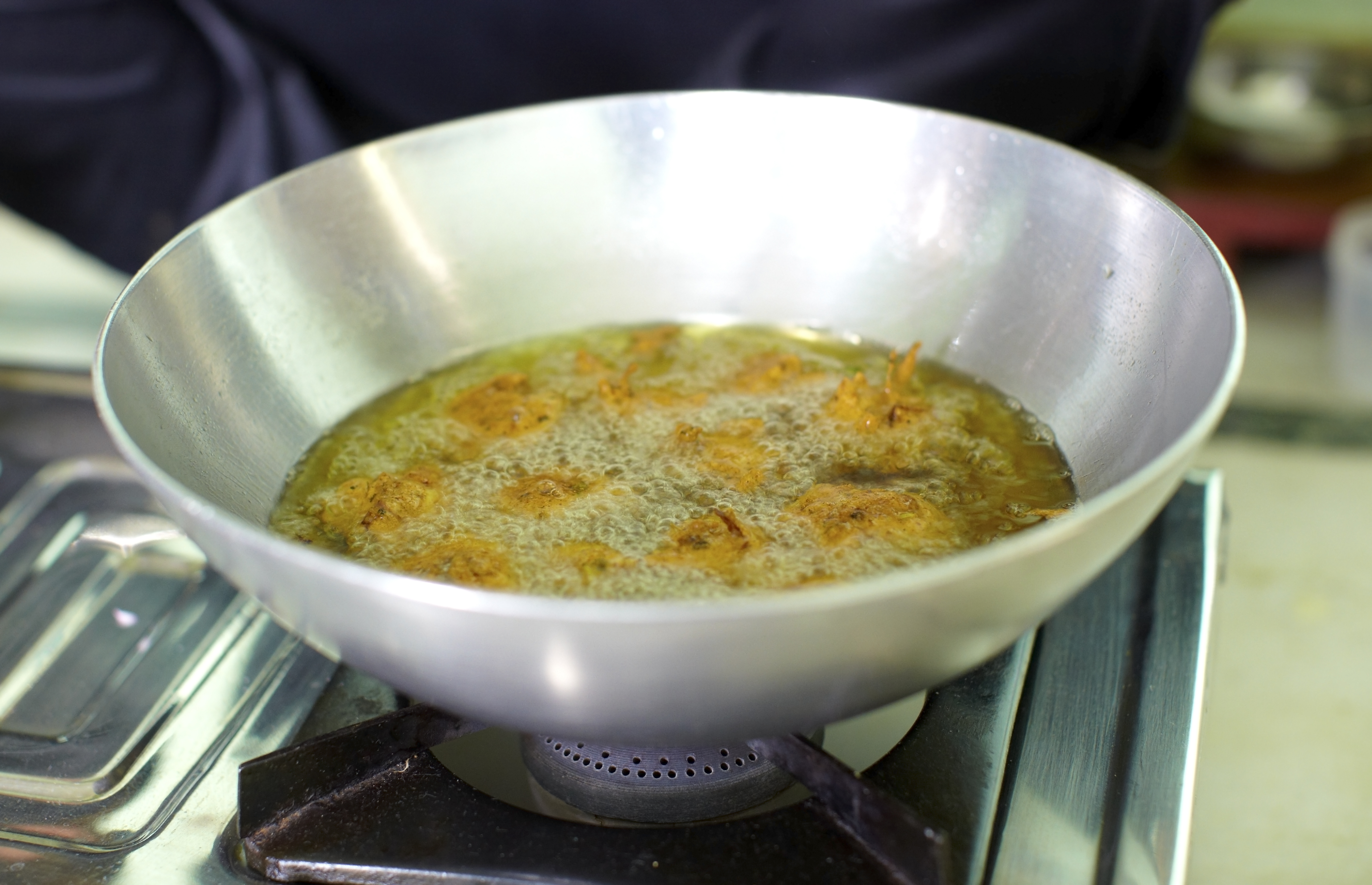 Čau! Cvreš lahko v navadnem rastlinskem olju, jaz sicer uporabim sojinega ali arašidovega. Olje na sliki pa je precej temno, ker Indijci toliko časa znova in znova uporabljajo isto olje. Ta posoda je nekakšen enostaven vok. Prizor sem slikala v Indiji, kjer so takšne posode običajne. Fenugreek je pa rastlina katere tako semena kot listi so skorajda vedno v curryjih. Mislim, da se jo tudi že pri nas dobi, sicer pa je prav tako okusno brez nje. Gre le za nianse v okusih.
