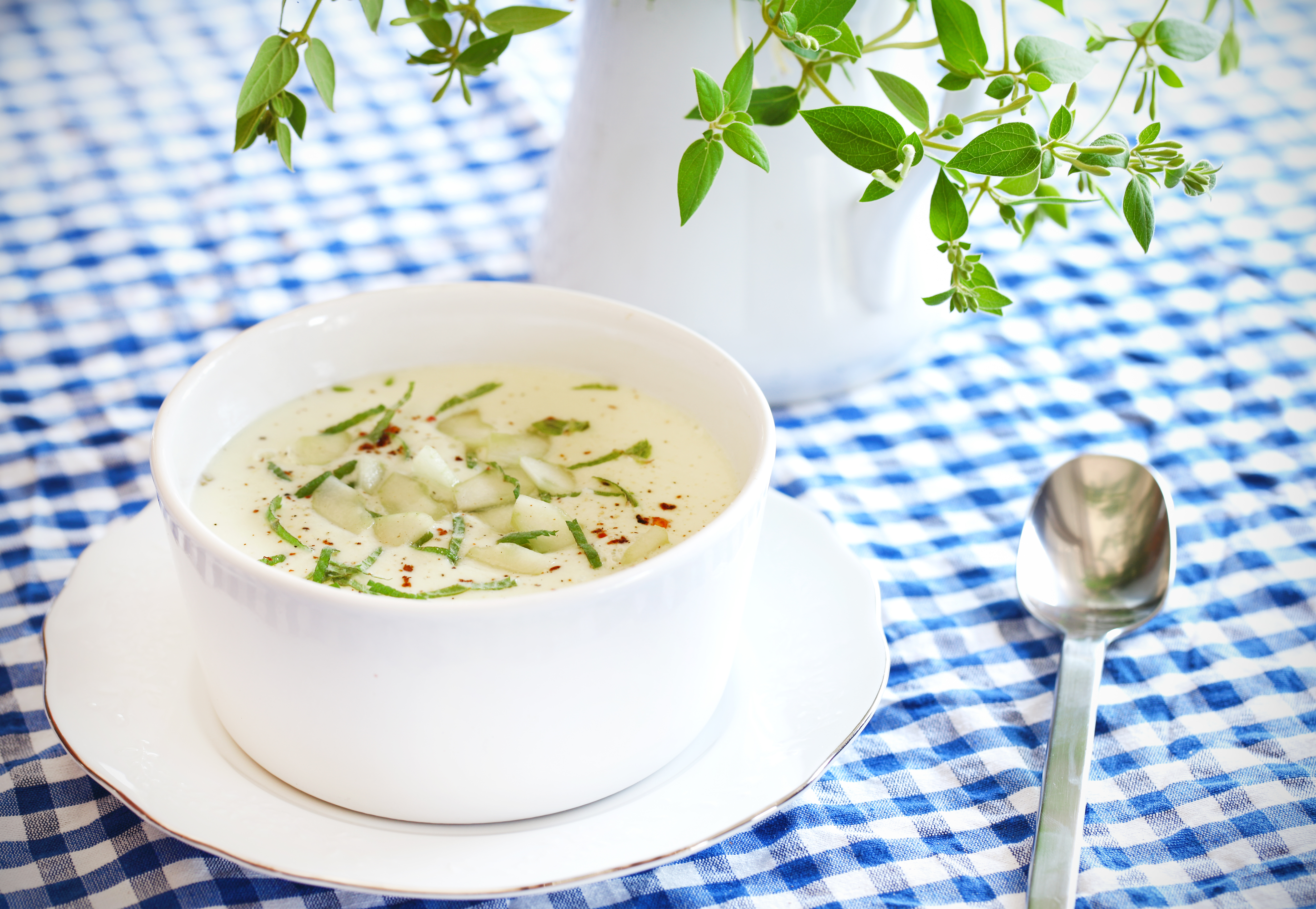Potrebuješ 2 kumarici katere olupiš, odstraniš peške in razrežeš na manjše kose. 5 cm kos pustiš za dekoracijo ostalo daš v mikser. Razpoloviš pol avokada in kose dodaš kumarici, prav tako dodaš en do dva strta stroka česna, 5 cm olupljenega ingverja, 2 jogurta, 200 ml mleka, 5 žlic jabolčnega kisa, 300 ml mrzle vode in 3 žlice olivnega olja ter sol po okusu. V originalu se sicer dodaja običajno mleko, jaz pa sem ga nadomestila s kokosovim. Vse skupaj zmiksaš do nežno kremastega. Če je juha pregosta dodaš še malce vode. Juho zliješ v jušne krožnike in okrasiš z malce popra, narezanimi listi mete, mletim suhim čilijem in na rezine narezanim ostankom kumare.