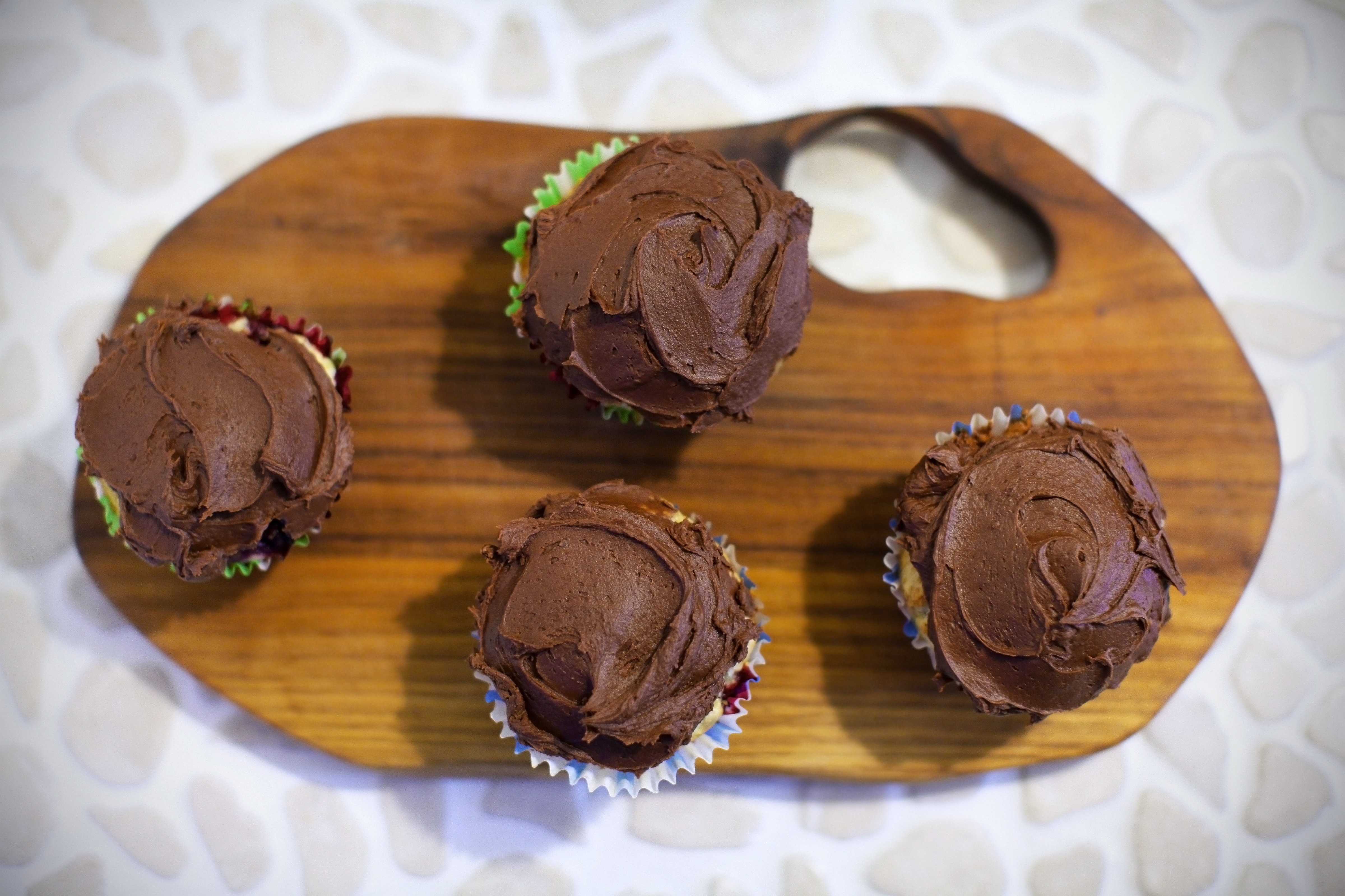 Premaz pa narediš tako, da 115 g čokolade sesekljaš, dodaš žlico vode, nato pa jo stopiš nad “vodno kopeljo”. Posebej stepeš 55 g zmehčanega masla s 100 g sladkorja v prahu. Ko je dobro premešano dodaš en rumenjak, dobro vmešaš potem pa dodaš še stopljeno čokolado, zmešaš. Posodo postaviš na hladno, da se malce strdi. S čokoladno maso izdatno premažeš mafine.