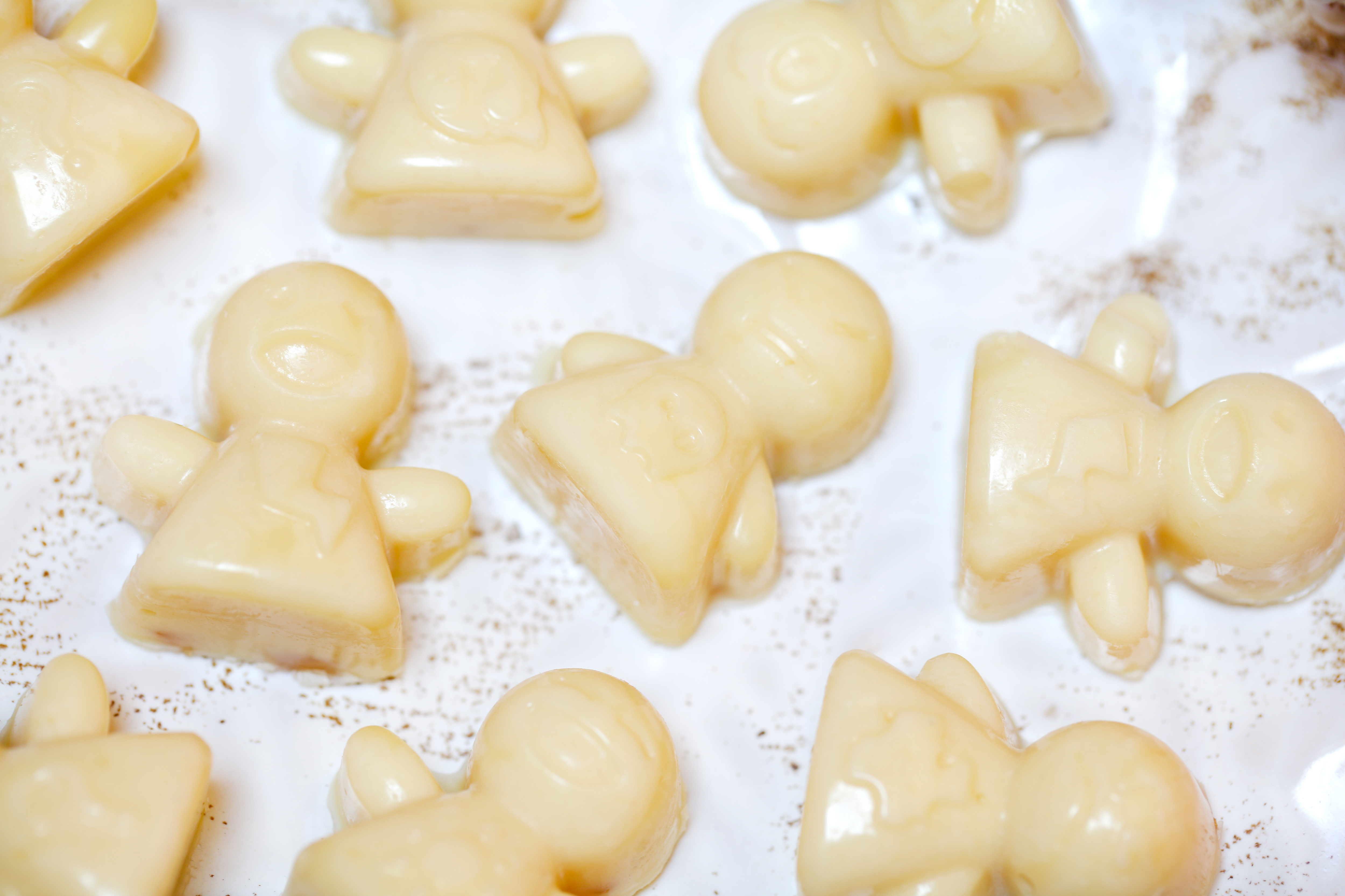 Nad parno kopeljo sem stopila belo čokolado – približno 100 g in ko je bila še hladna, sem čez prelila žlico sladke smetane ter žličko ingverja v prahu. Ko se čokolada stopi, premešaš in napolniš modelčke. V dno sem vtisnila še kandirane lupinice pomaranče, potem pa sem modelčke zaprla za 10 minut v zamrzovalnik. Naslednjič pride na vrsto temna čokolada s solnim cvetom… ali pa s čilijem… ali pa pol temne čokolade in pol lešnikove kreme… Mmm, ali pa mlečna čokolada z mletimi orehi… …