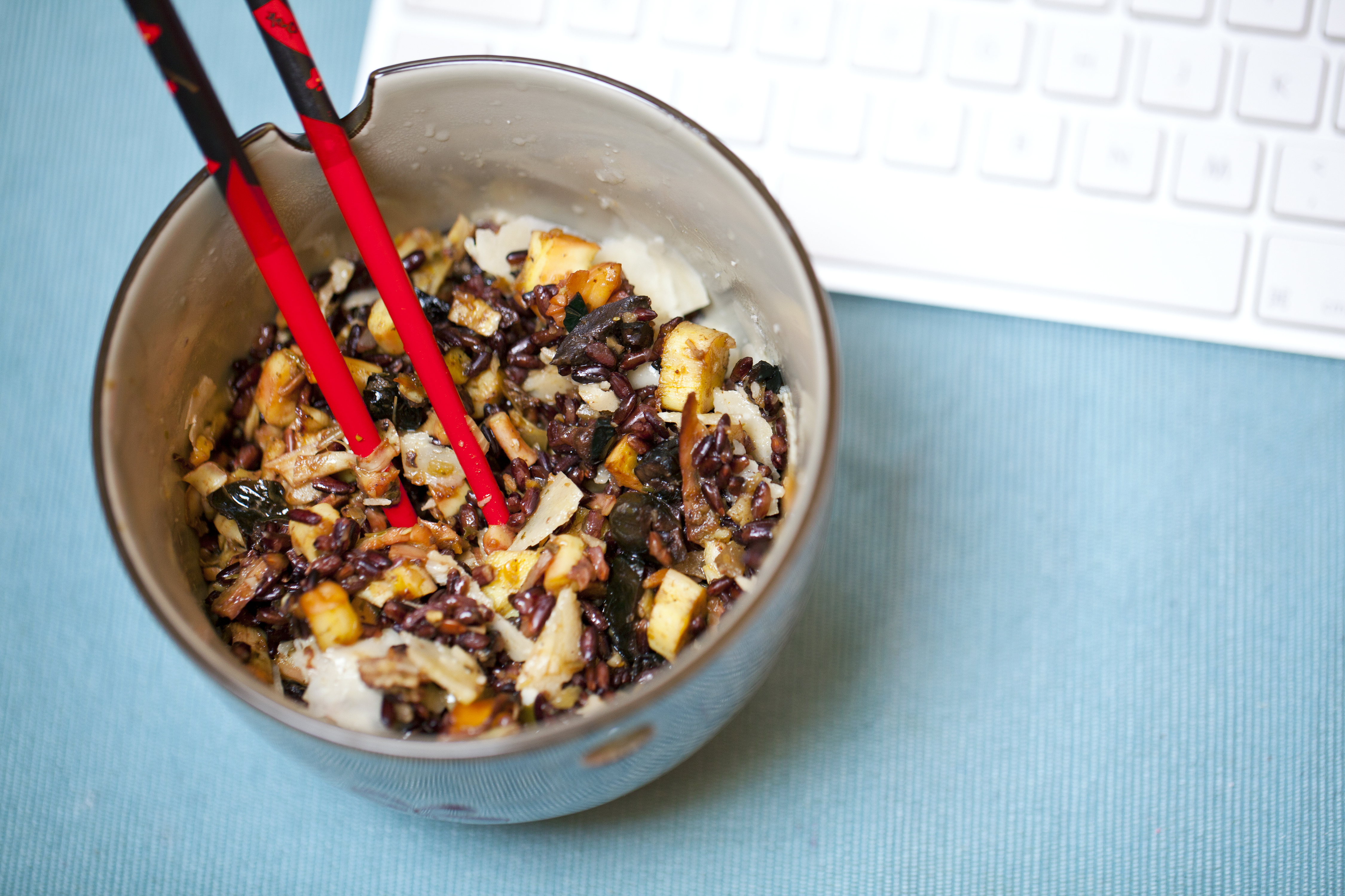 Črn riž oziroma prepovedan riž ali pa vijolični riž je sorta riža, ki je po izgledu in okusu malce bolj vznemirljiva kot običajen bel riž. Bojda je tudi bolj bogat z aminokislinami in ostalimi dobrotami. Skuhan, dobi globoko vijolično barvo in na ugriz je malce bolj “spužvast” in mehak, ni pa dovolj škrobast, da bi iz njega naredili klasično kremasto italijansko rižoto. Zdelo se mi je, da bi se zraven podalo nekaj s podobno teksturo a bolj izrazitim okusom – goji jagode in lovke orjaškega lignja.