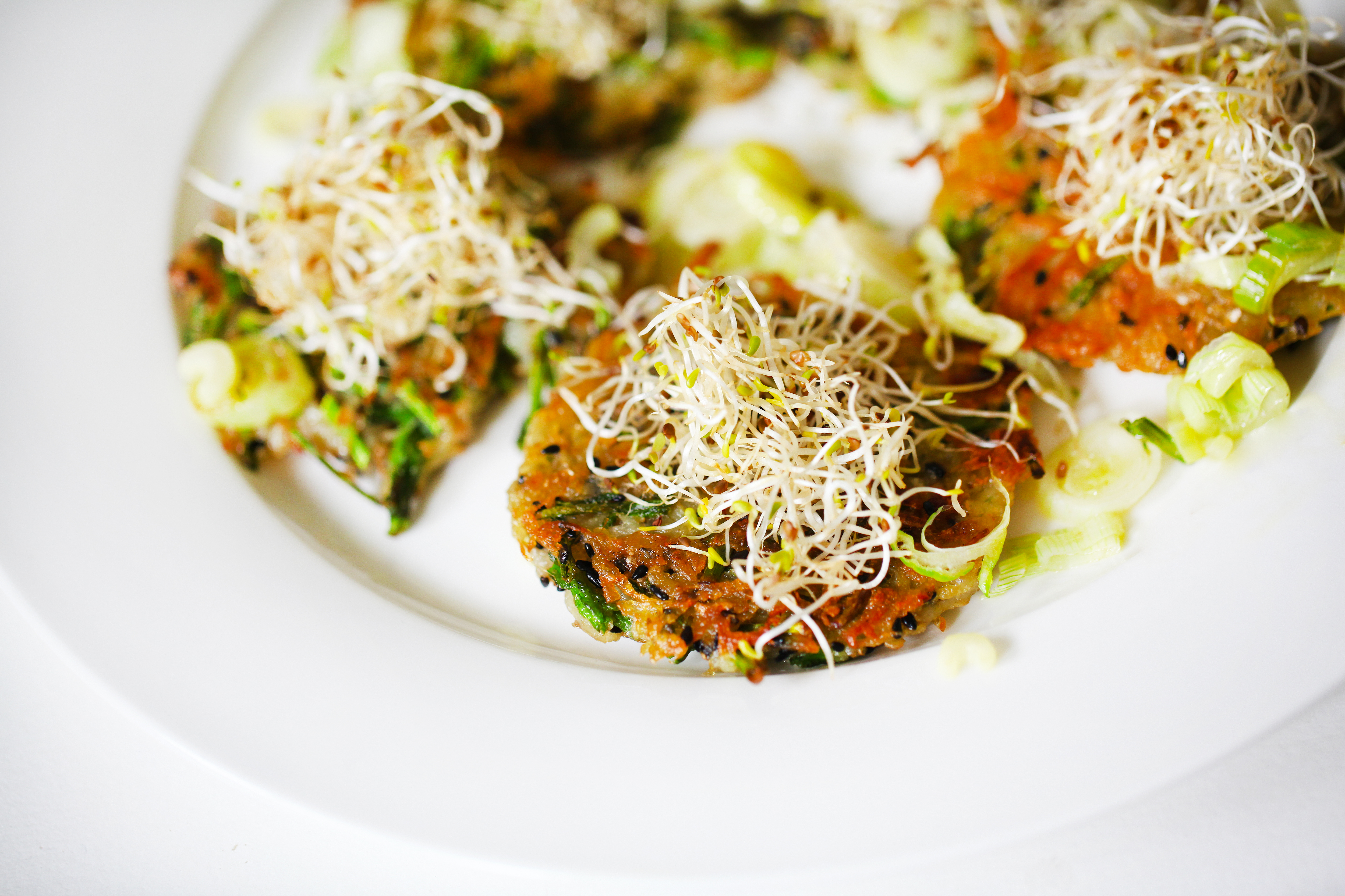 Šopek divjih špargljev 2 min blanširaš v kropu, zatem jih ohladiš v ledeni kopeli in zrežeš. Krompir naribaš in pokapljaš z limoninim sokom, da ne porjavi. Krompir zmešaš s šparglji, dodaš malo črnega sezama in začiniš. Po nekaj minutah bo zaradi soljenja prišlo do rahle ozmoze, krompir bo zaradi škroba postal bolj lepljiv in ravno pravšnji, da iz njega oblikuješ male tortice, ki bodo brez problema obdržale svojo obliko. Tortice nežno popečeš na olivnem olju in jih postrežeš z mlado čebulico in kalčki.