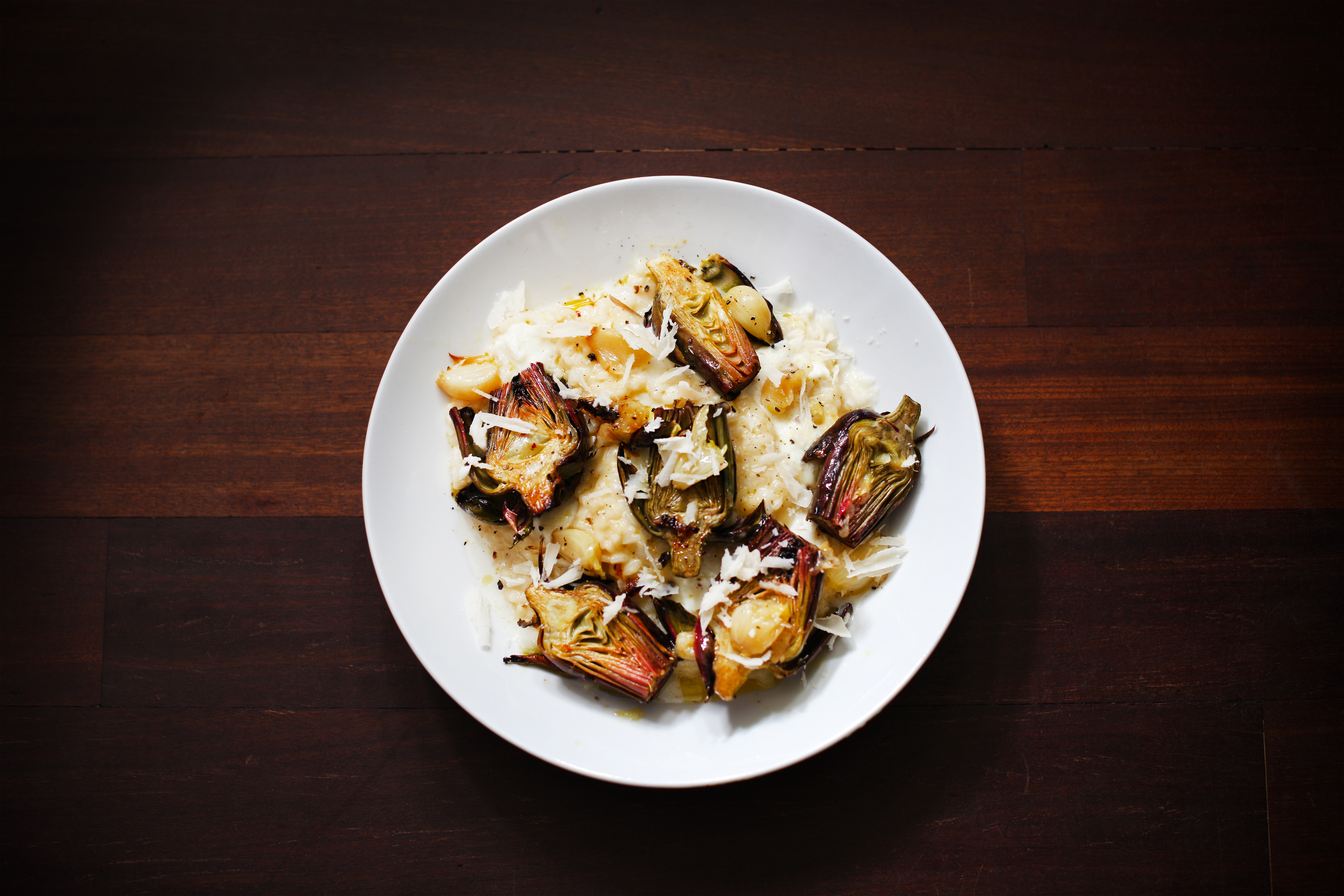 Na maslu popražiš riž za rižoto (arborio), da zastekleni potem pa ga zaliješ z 1,5 dcl belega vina. Vesčas mešaš. Ko se vino vpije, postopoma dodajaš vročo zelenjavno jušno osnovo. Vsakič po pol zajemalke, nič več. Tako dodajaš in mešaš približno 20 minut. Riž mora biti lepo kremast ampak ne razkuhan. Tik prej, ko naj bi bila gotova, odstaviš rižoto z ognja in vanjo raztrgaš 100 g bivolje mocarele. Premešaš, začiniš in z njo takoj na krožnik. Ko so artičoke gotove, jih pokapljaš še z limono in zložiš na rižoto. Česen stistneš iz olupka in dodaš na krožnik. Na vse skupaj nastrgaš še parmezan in streš malo popra.