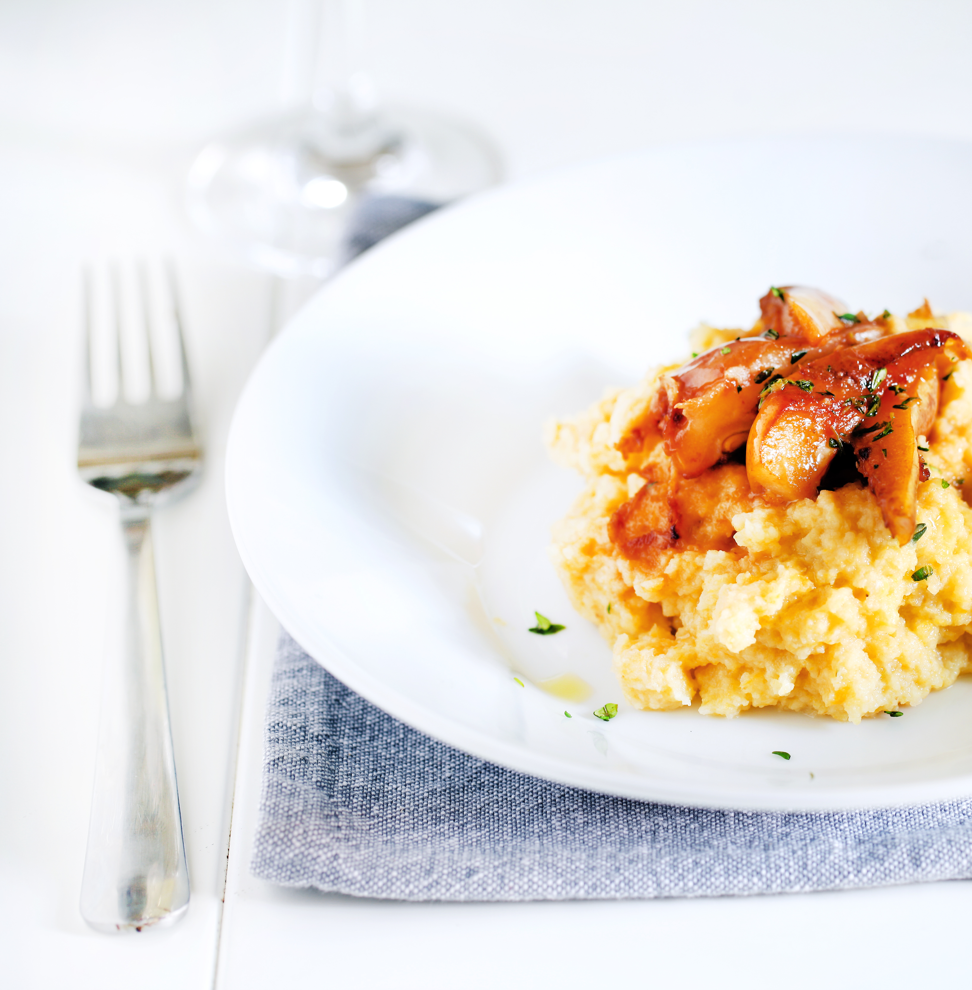 Hruške zrežeš na krhlje, nanje posuješ žlico trsnega sladkorja, naribaš za pol palca svežega ingverja in sok ene limone. Hruške nato počasi pražiš na kokosovem maslu, da postanejo lepo karamelizirane. Potem postrežeš na krožnik pire, na vrh naložiš hruške. V vročo ponev zliješ žlico vode, da pobereš osledlinice, ki so se naredile med praženjem in s tem preliješ hruške. Manjka še malo svežega timijana in ščepec sveže mletega popra.