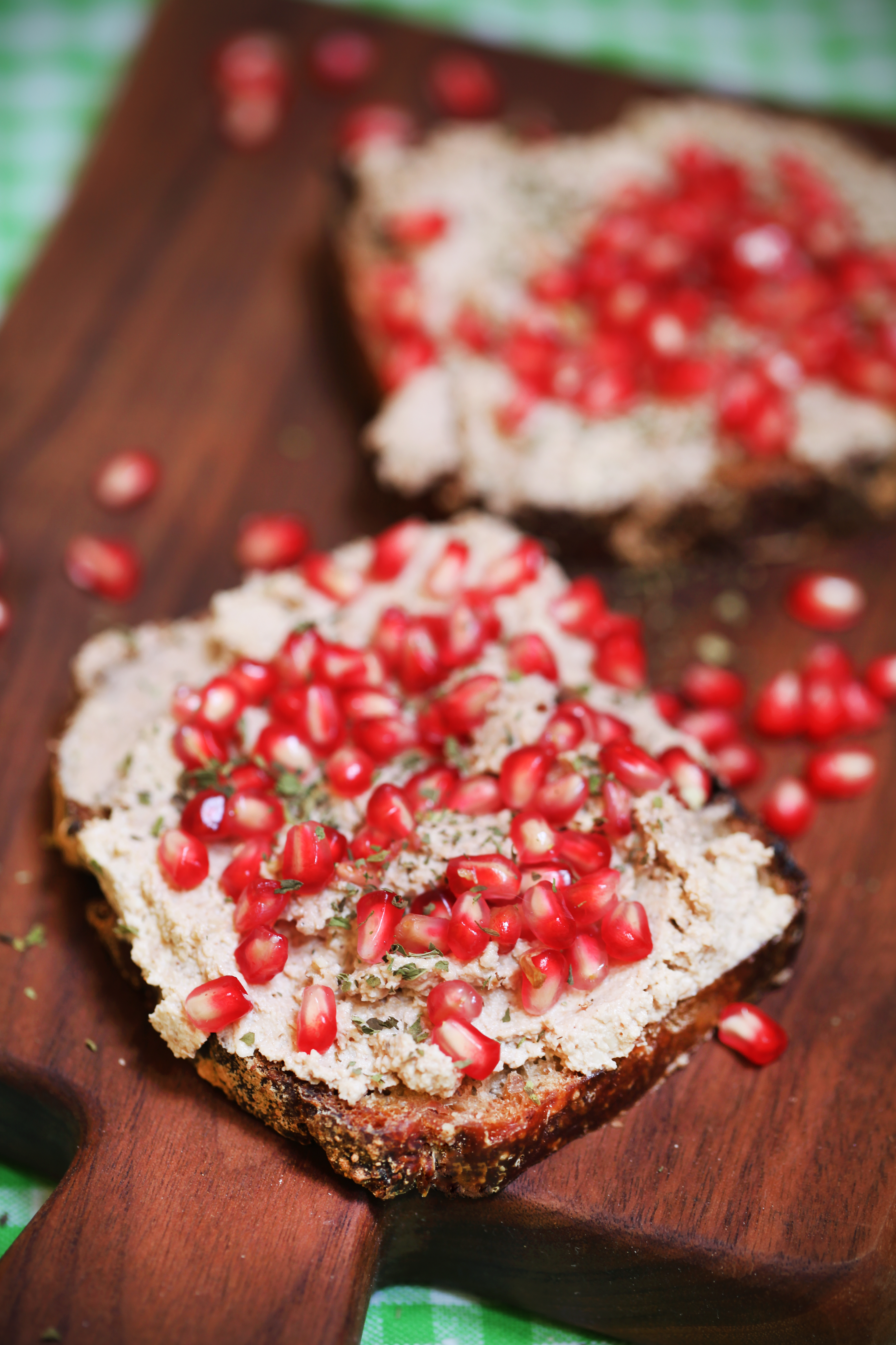 Jaz sem ga namazala na domač kruh iz droži in iz ržene moke, kuhane rži in pokuhanih rženih kosmičev ter ga podrobila z granatnim jabolkom in meto. Mljask.