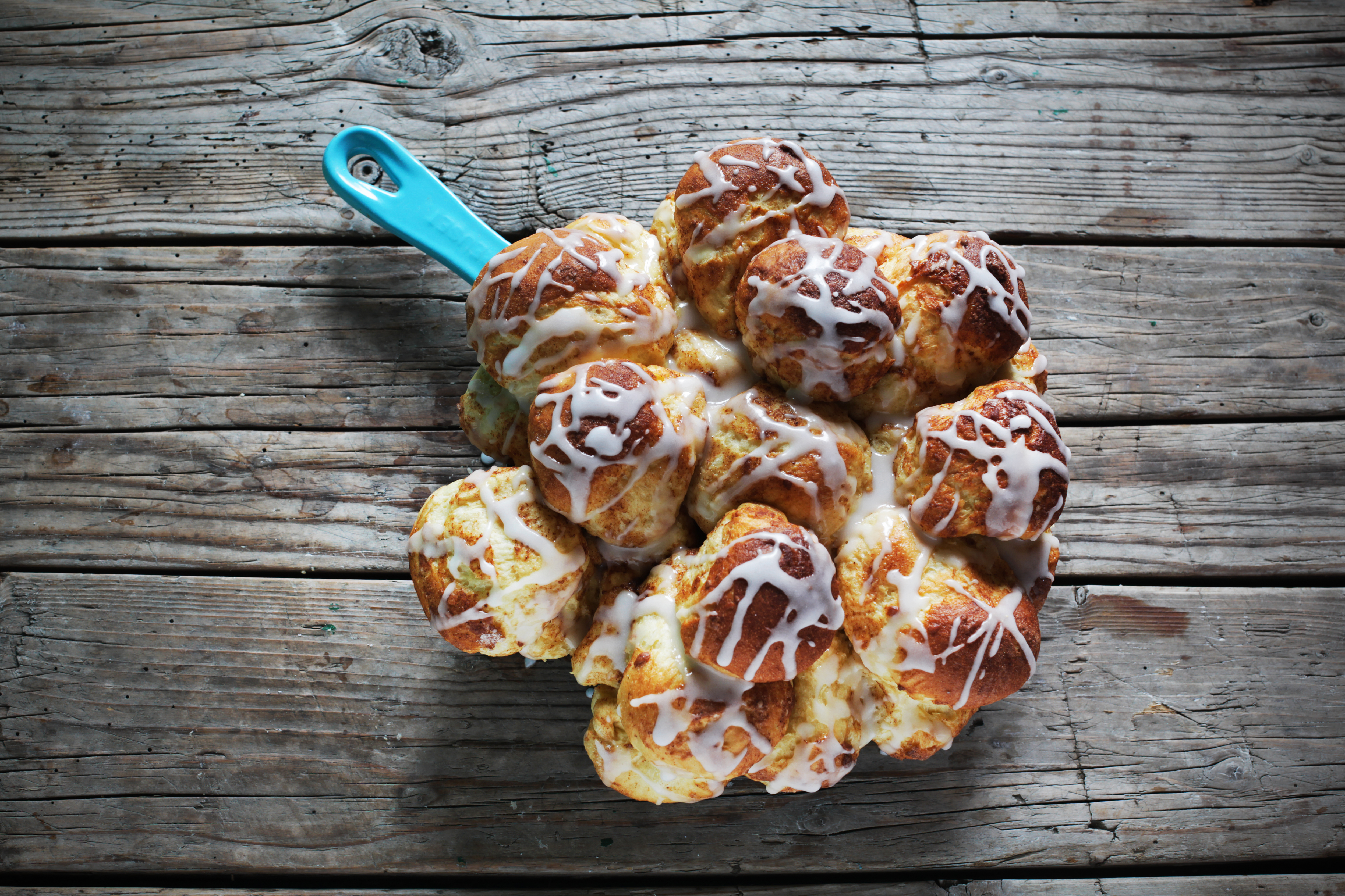 Buhtlji malo drugače – iz ponvice in utrgani. Čudovito izgledajo postreženi kar tako, direktno iz ponve in zdi se, da subtilno simbolizirajo decembrsko družabno vzdušje, ko se tako tesno stiskajo eden ob drugega. Potem pa si lahko vsak si utrga svojega, ga pomoči v vročo čokolado, zagrize vanj ob kuhanem vinu ali klasično angleško namaže nanj malo putrčka ob skodelici čaja.