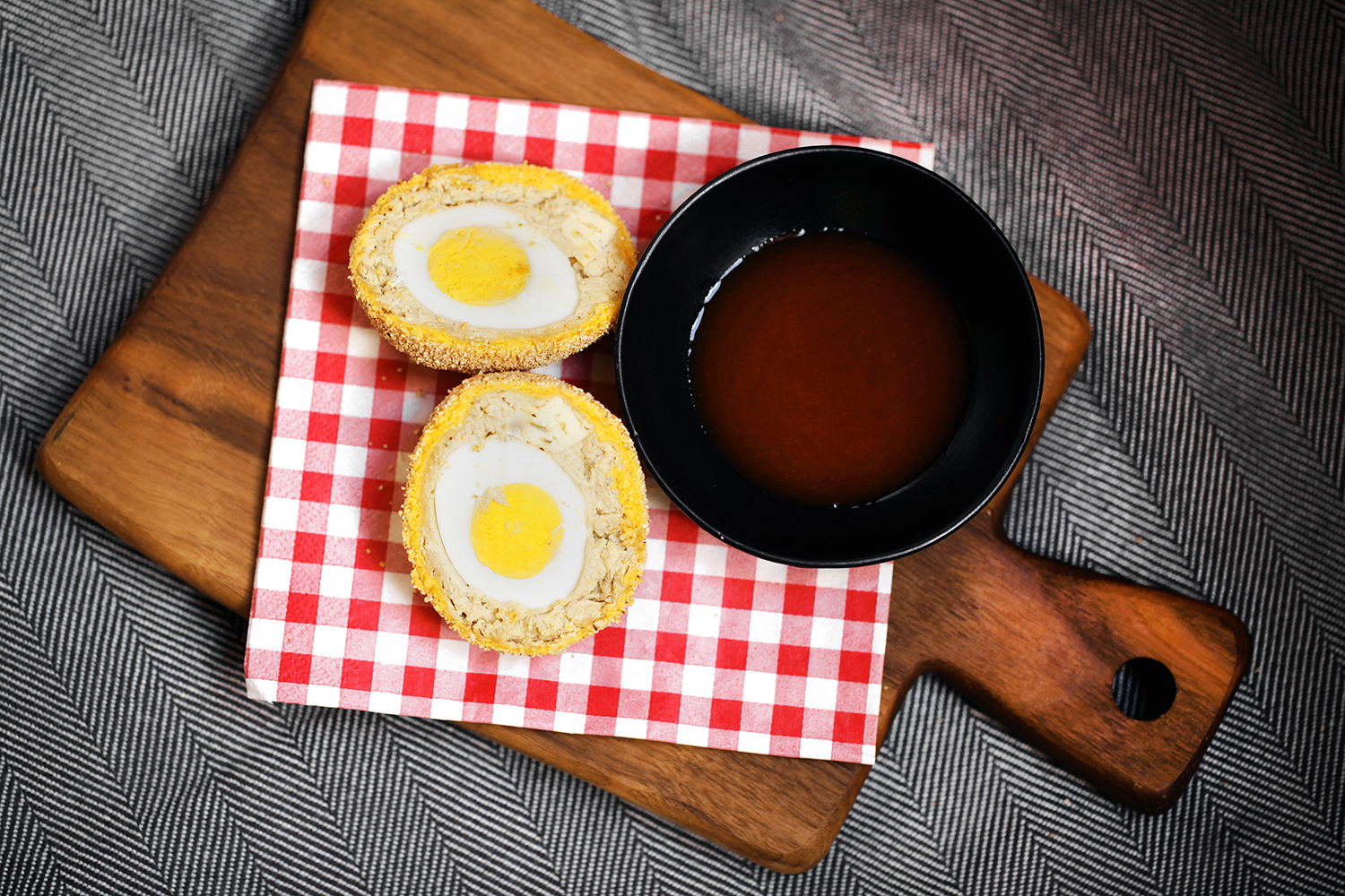 Velikonočnih je konec in če so oči večje kot želodčki, potem je sigurno ostalo še kaj pirhov in nekaj šunke. Scotch eggs so po klasičnem receptu odeti v mesni ovoj in panirani v krušnih drobtinah. Jaz sem recepturo malo predrugačila – s tolažbo, da bodo bolj zdravi kot mesni, ne toliko, da bo vegetarijansko, in uporabila namesto mesa tofu in namesto krušnih drobtin grobo koruzno moko.
