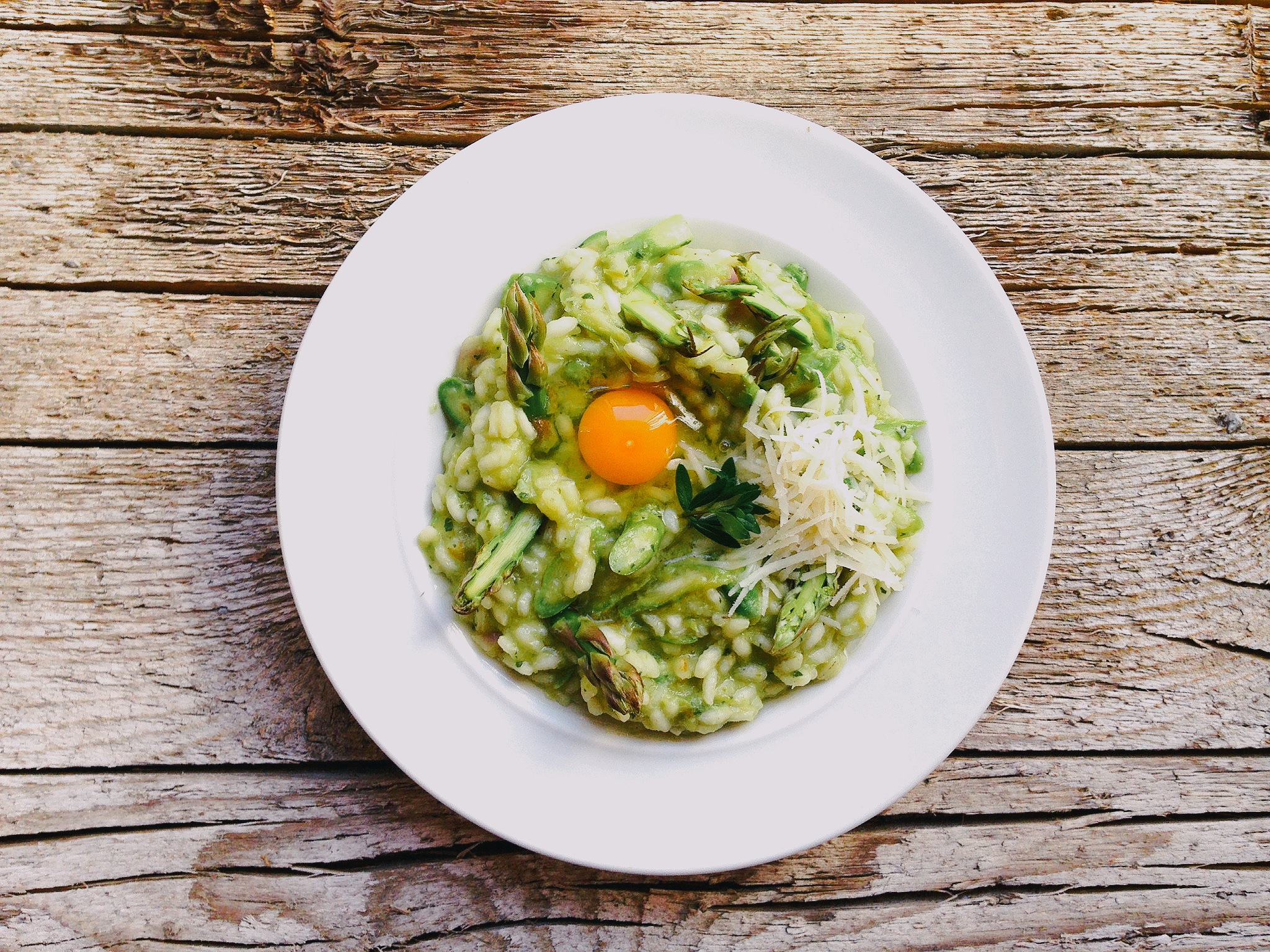 Zvestim fenom špargljev, takšnim kot sem jaz, špargljev ni nikoli zadosti. V rižoti, ki sem jo kuhala čez vikend so šparglji pripravljeni na tri načine. Najprej so kot omakica, potem so delno pokuhani tanki lističi in nato še surovi prepolovljeni vrhi. Tisto rumeno tam pa je prepeličje jajce, ki se tako fino prilega k tej večteksturni rižoti, saj ji subtilno doda nežnost v ustih, tako da ni nič narobe, če si vanjo streš kar dve.