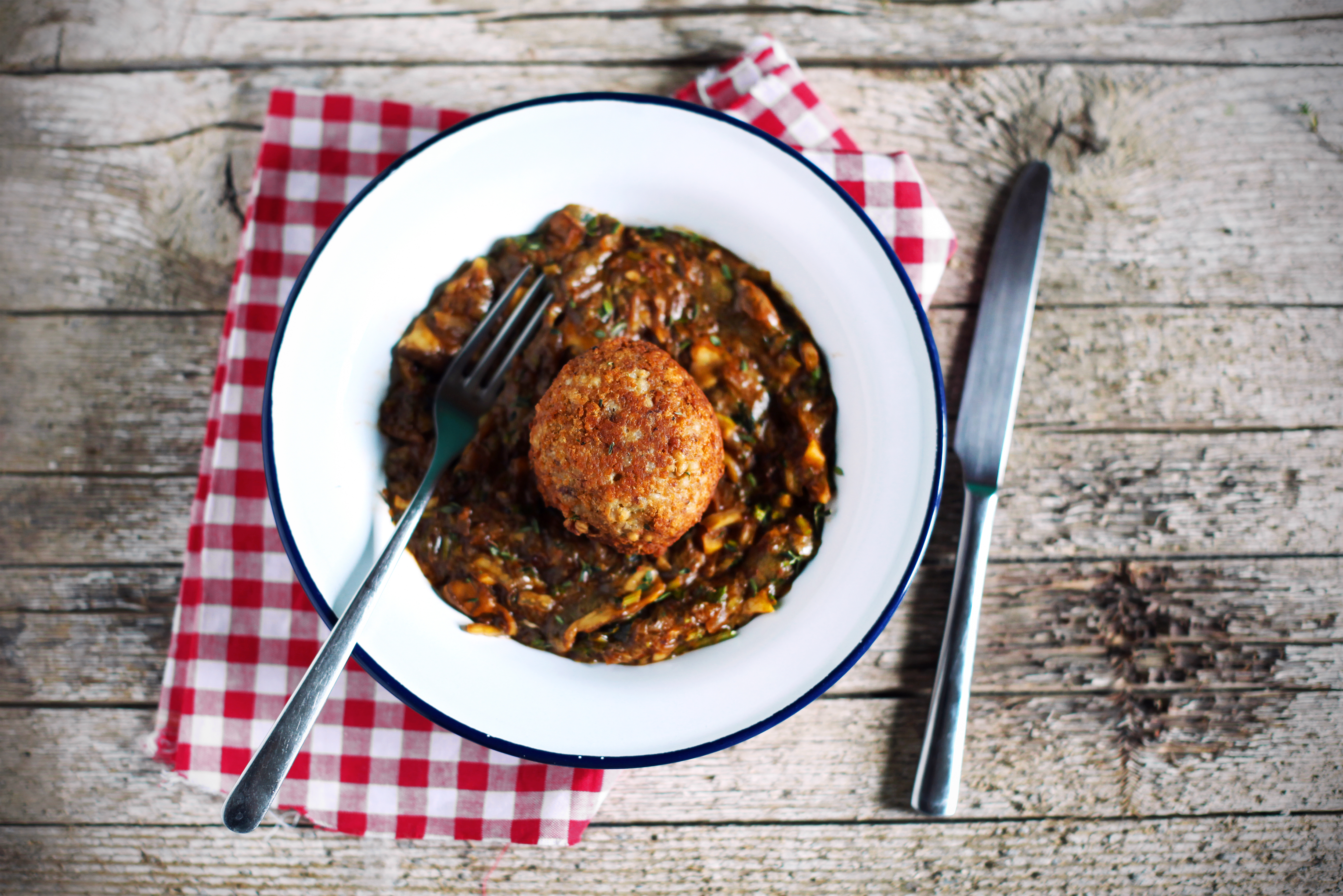Arancini se običajno naredijo z ostankom rižote oziroma z rižem tipa arborio. Jaz sem si arancin zamislila malce drugače in ga naredila z ješprenom, sedi pa v sadovih nedeljskega gobarskega izleta.
