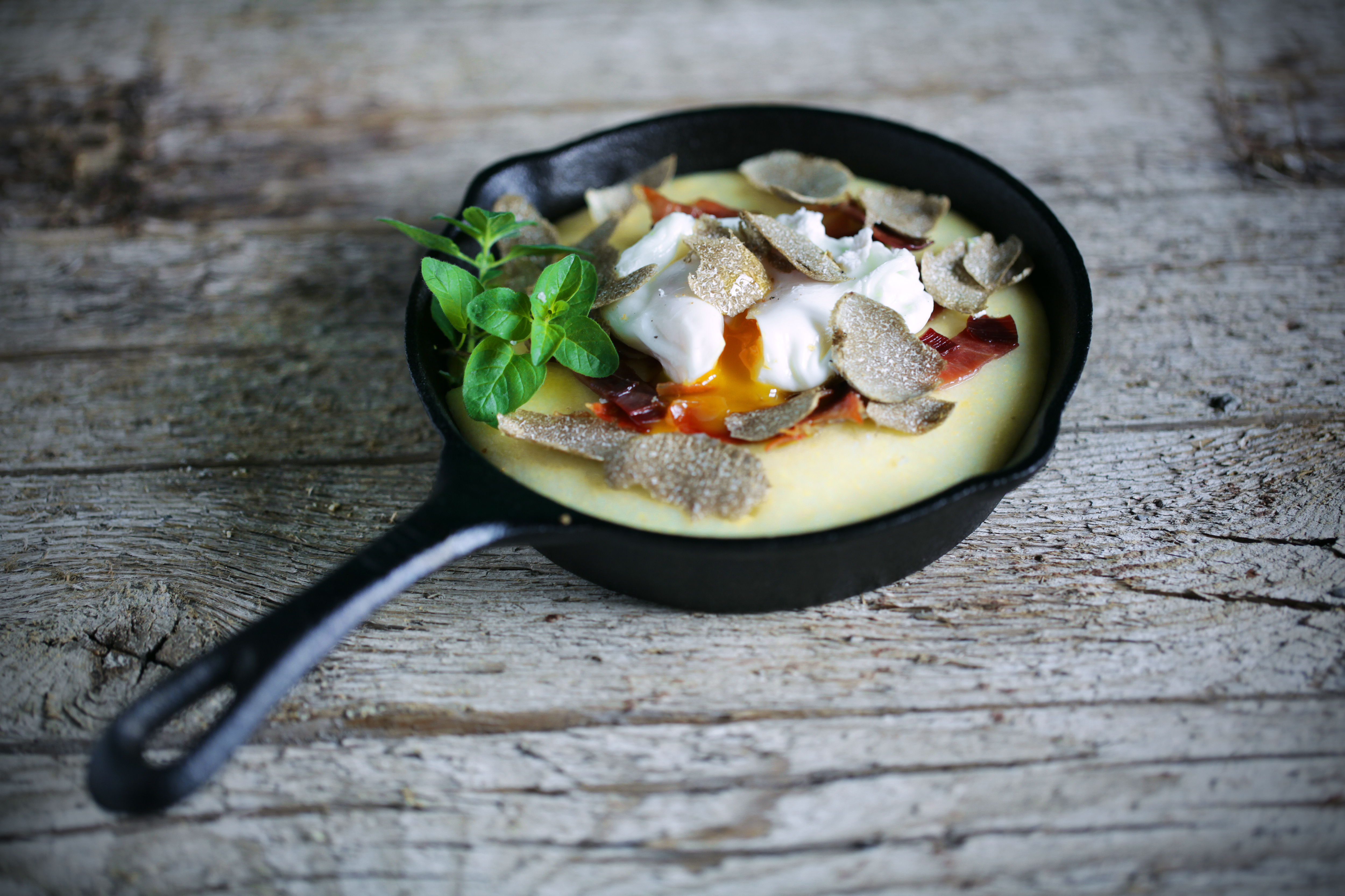 Za agliot najprej skuhaš dober krompir, cca 400 g. Če imaš čas pa priporočam, da ga skuhaš v sopari, saj bo jed še bolj polnega okusa. V ponvici v žlici masla na najbolj nežnem ognju popražiš dva do tri stroke česna. Daj mu čas, da se lepo prepoji z maslom, da postane sladkast in kremast. Ko je krompir dobro skuhan, ga skupaj z maslom in česnom v mikserju začneš počasi mešati. Soliš, popraš in dodaš nariban sir, cca 200-300 g. Izbereš dober sir. Jaz sem dodala comte, ki je masten in precej intenziven. Vse skupaj naj se zmeša v čudovito svilnato kremo. Če se preveč shladi, ga dogrevaš nad soparo. Svoj agliot sem obogatila z debelo narezanim pršutom, poširanim jajcem, po vrhu pa naribala malo črnega tartufa.