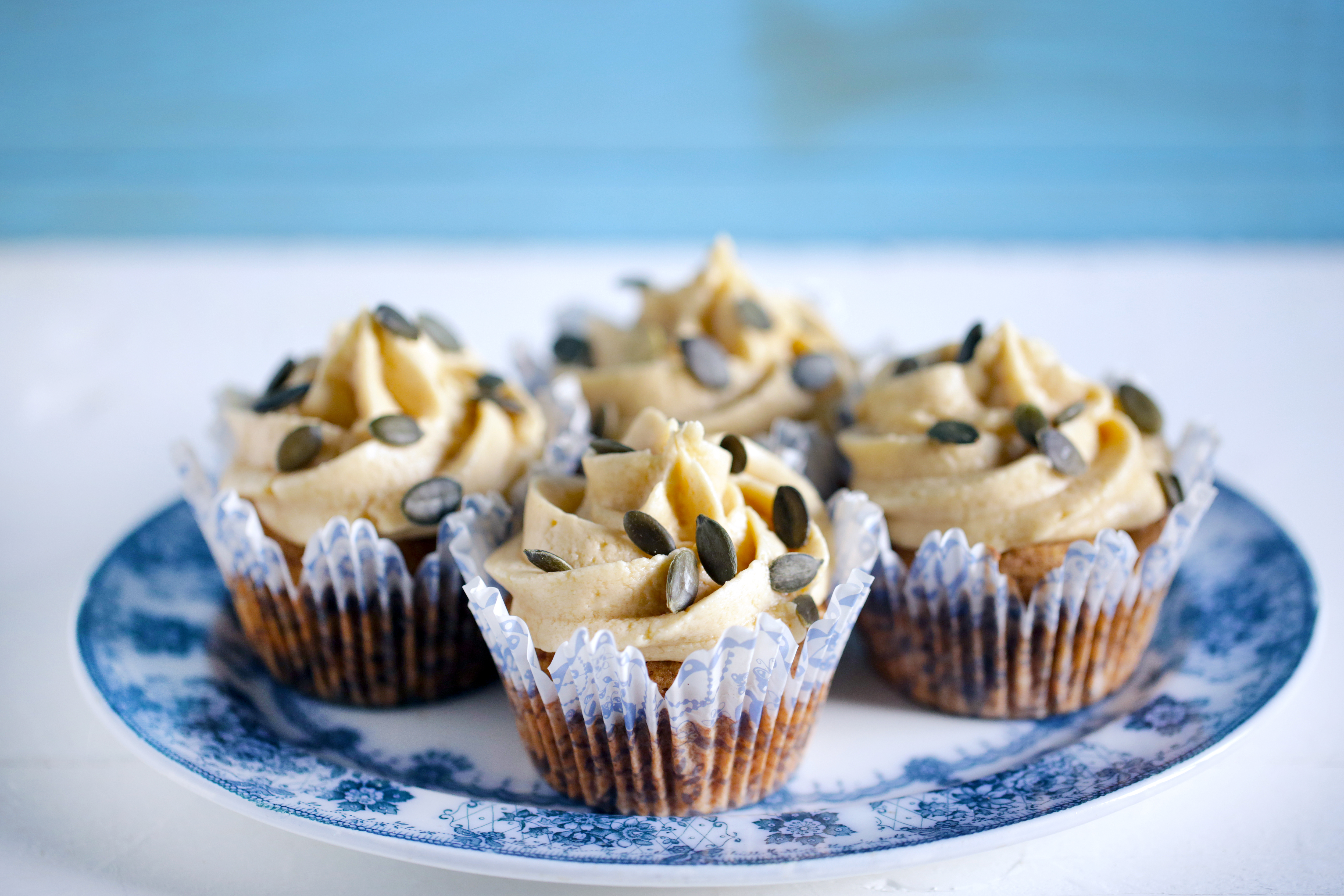 Ko so mafini popolnoma shlajeni jih okrasiš s sladko bučno kremo in potreseš s popečenimi bučnimi peškami.