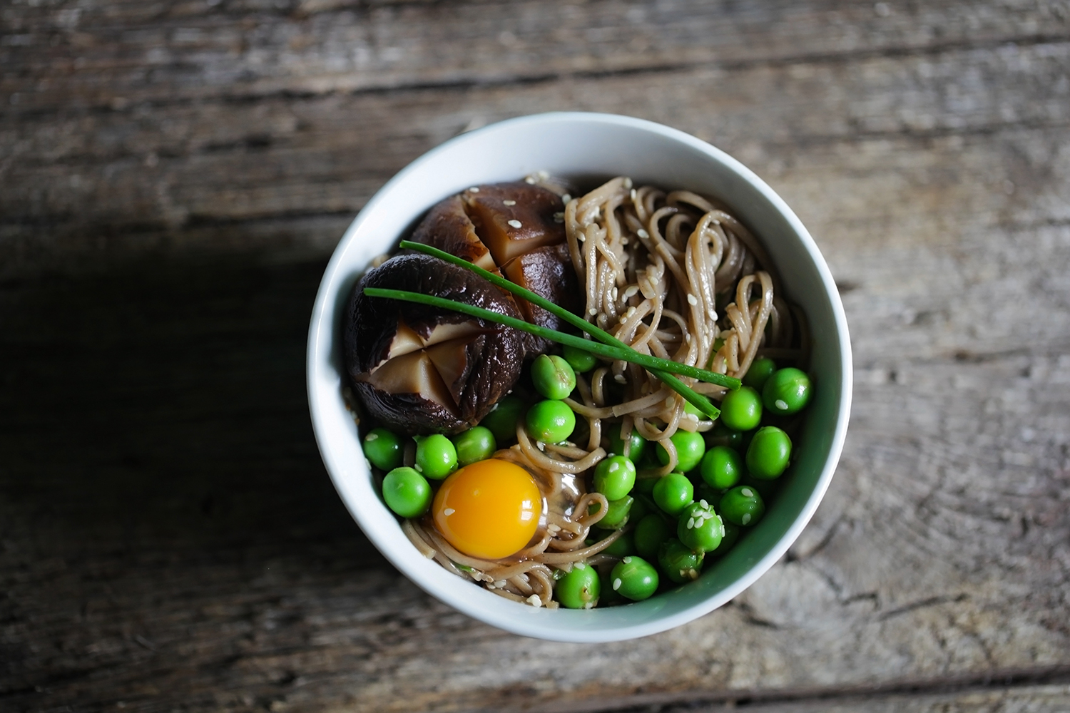 Vse sestavine zložiš v skodelico – najprej rezance, potem grah, šitake, na rezine narezano mlado čebulo, poliješ s preostankom omake, potreseš s rahlo praženim sezamom in na zadnje čez ubiješ surovo jajce.