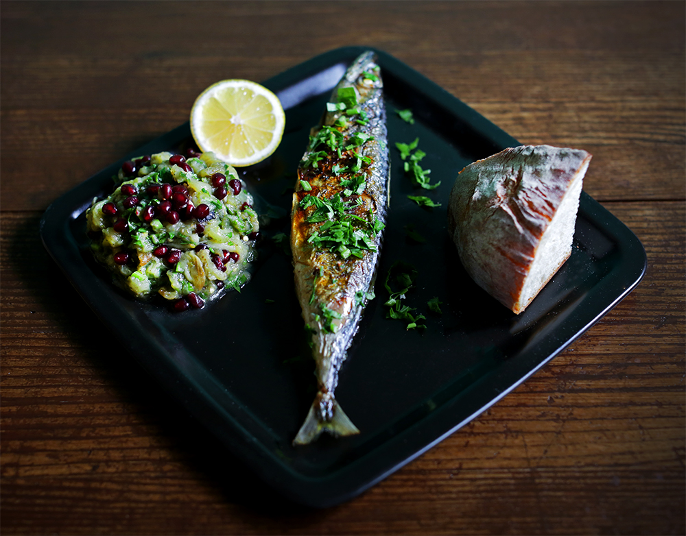 To ni zgodba o eni ribi, temveč o žgani melancani, ki tokrat ni baba ghanoush temveč je solata. Tista riba je skuša z žara, pa bi se zraven takisto dobro prilegale sardelice ali pa celo jagnjetina ali goveja rebra z žara. Torej nekaj kar ima podoben vonj in okus žara in ne vrčuje z maščobami.