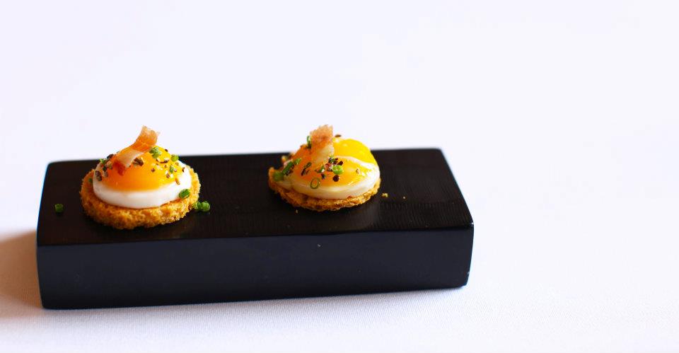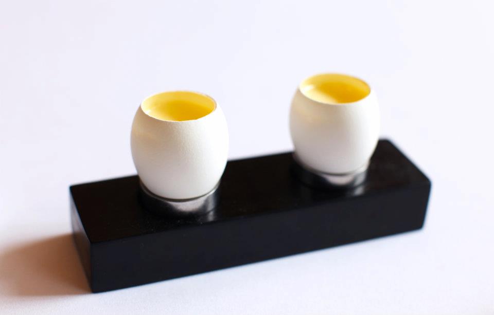 Zabaione with smoked salmon and chervil oil in an egg shell