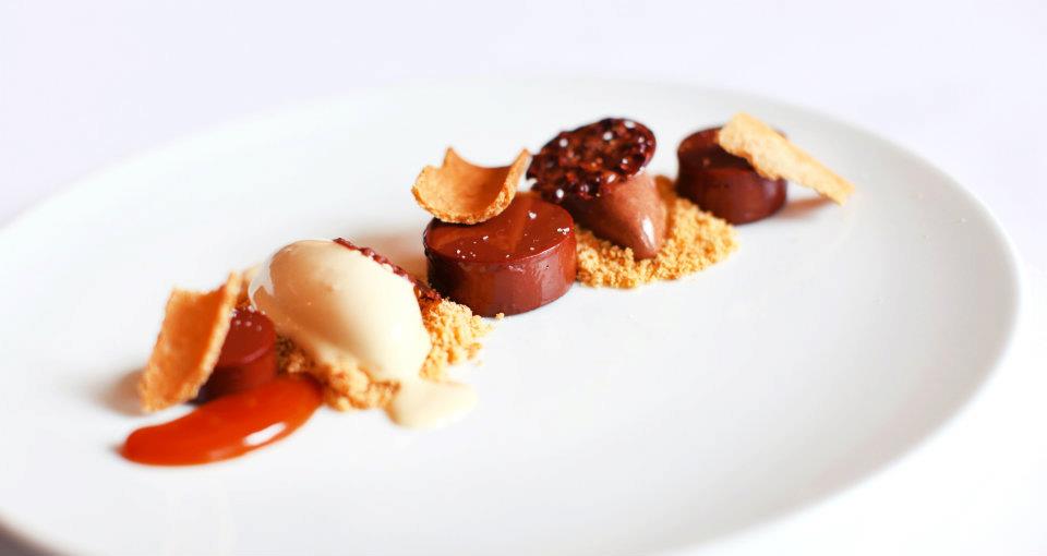 Chocolate tart with salted caramel, cocoa nibs and chocolate sorbet