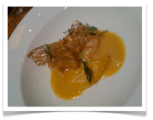 2. Topla predjed: počasi kuhani škampi, pire buče, rakov bisque z vanilijo, in hrustljav rženi kruhek. Bisque je imel malo preredek okus sicer pa so bili škampi odlični.