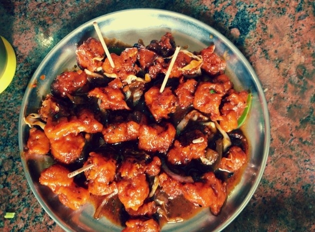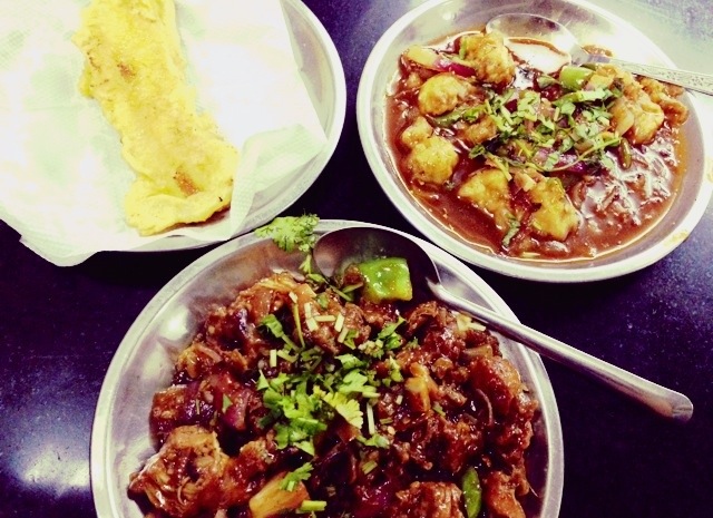 Chilli chicken, gobi manchurian, fried platain