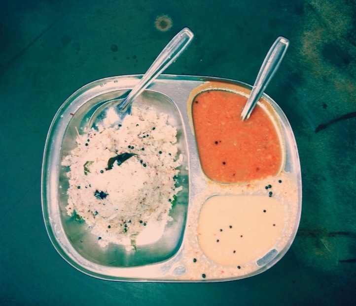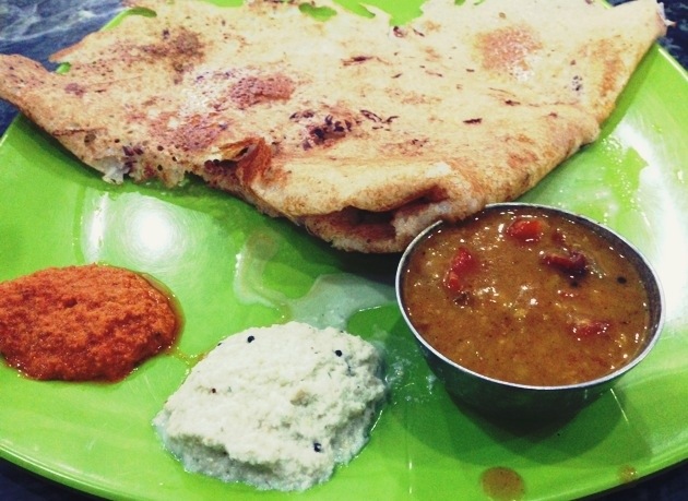Onion uttapam w coconut, tomato and corriander chutney, sambar