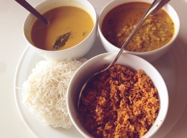 String hoppers w tuna fish curry, dal curry, coconut sambar