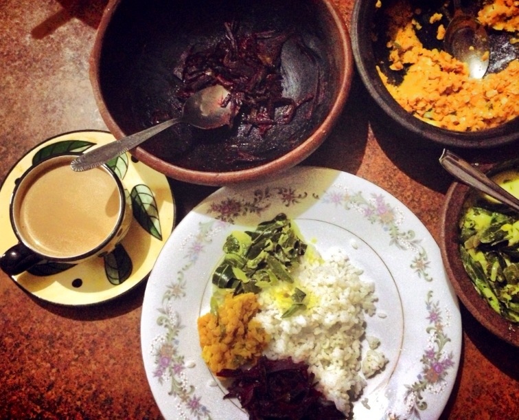 Fried dal, curried beetroot, murunga leaves curry