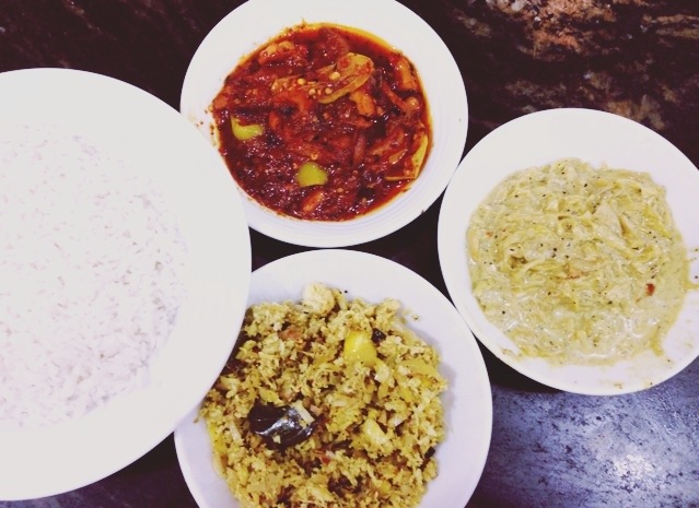 Long bean curry, pepper and dried fish curry, jackfruit curry, coconut sambar, mackrel