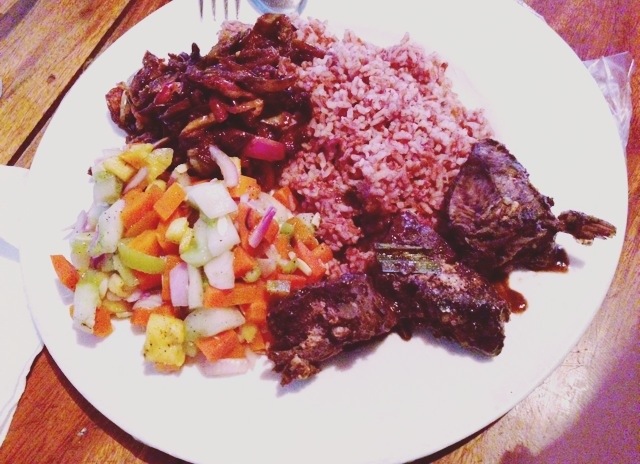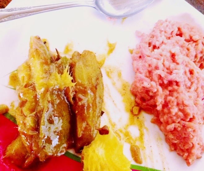 Tuna curry, eggplant and tamarind curry, pineapple salad and red rice