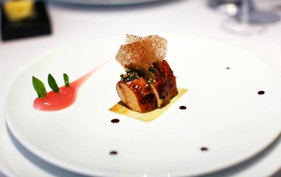 Roast Foie Gras, Rhubarb, Braised Kombu and Crab Biscuit