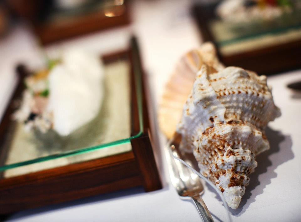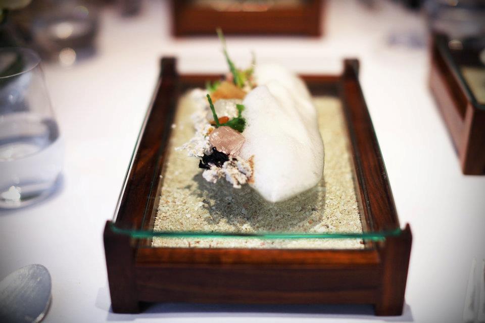 (Dish comprises of a various fish and scallops in sashimi cuts, dotted with various sorts of seaweeds, tapioca resembling sand and seafoam tasting of vegetable stock. In a Conch was an Ipod playing sounds of the waves and seagulls – it is a sort of a mind trick. Your food tastes saltier than it would without listening to the sea.)