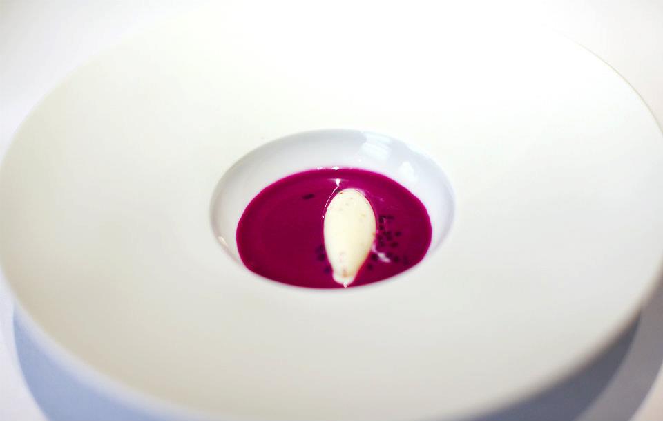 Red Cabbage Gazpacho with Pommery Grain Mustard Ice Cream