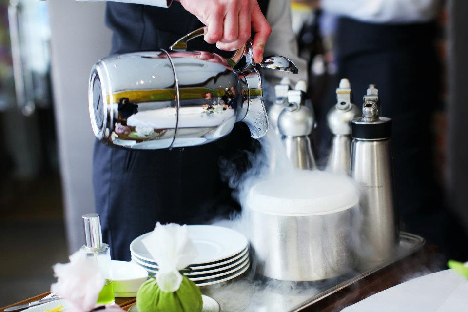 (Selected concoction was dipped in liquid nitrogen, than the waiter would spray lemony mist above your head and that was your cue to eat the aperitif.)